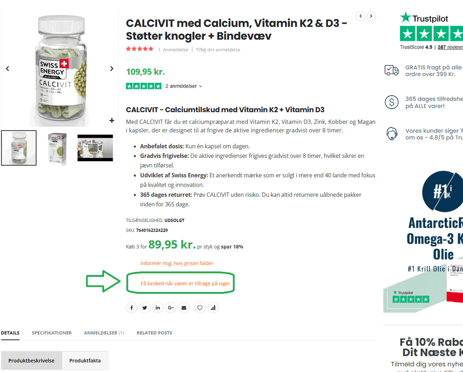 Kort svar: Den hurtigste måde er at tilmelde dig notifikation på produktsiden – så får du en e-mail, så snart varen igen kan købes.